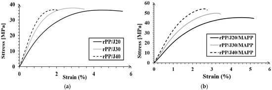 Tensile stress and strain curves of composites without MAPP (a) and with MAPP (b).
