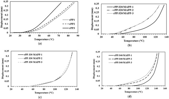 HDT curves of composites for (a) rPP, (b) rPP/J20/MAPP, (c) rPP/J30/MAPP, and (d) rPP/J40/MAPP.