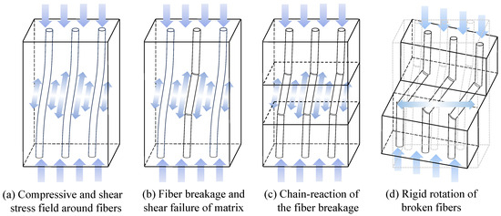 However, the distinctive characteristics of the narrow shape of the fibers inevitably reduce the compressive strength. It is often reported that the strength of CFRP under compressive loading is less than half of that under tensile loading [1]. A schematic of the failure process reported in the literature [2] is shown in Figure 1. When CFRP is subjected to compressive loading, the fiber is mainly broken as a result of the stress concentration due to small misalignment. The broken fibers with inclination to the loading direction cause shear stress in the matrix. When the shear stress exceeds the allowable value, the fibers start to rigidly rotate. The region formed by this failure process is called the kink-band and is reportedly the main cause of the reduction in compressive strength [2].