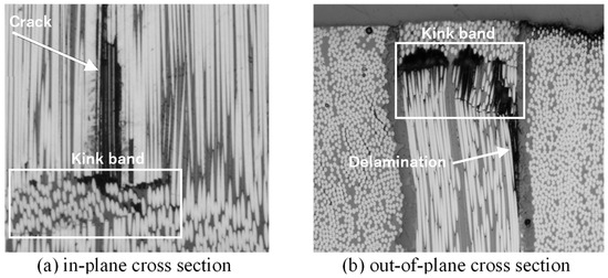 Since the effect of the kink-band on the reduction in compressive strength has been considerably revealed through many studies [7,8,9,10,11,12], one of the important points to be clarified further is the interaction between the kink-band and other failure modes, such as matrix cracks and delaminations. Figure 2 shows the cross-section of CFRP after compressive failure [13]. Scanning electron microscopies from in-plane and out-of-plane directions are shown in Figure 2a and Figure 2b, respectively. It is likely that the matrix crack above the kink-band in Figure 2a developed from the kink band due to in-plane shear deformation. Similarly, it can be presumed that the delamination in the vicinity of the kink-band in Figure 2b occurred due to the out-of-plane shear deformation of the kink-band. Although Schultheisz et al. mentioned longitudinal cracking in the matrix during compressive failure in their literature review [14], it is not the case that studies focusing on this issue are sufficiently conducted.
