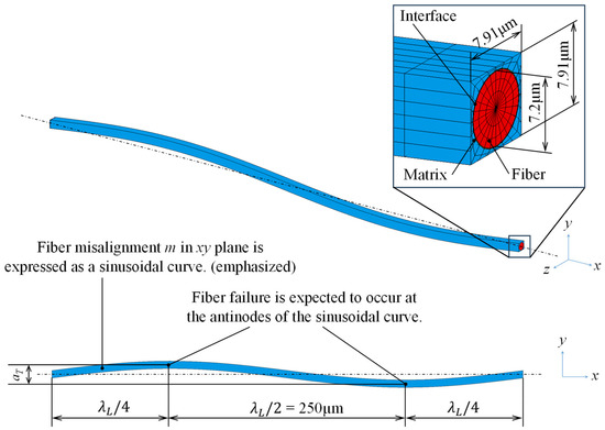 In our numerical model, the fiber misalignment is expressed by the amplitude of the sinusoidal curve aT. Therefore, the conversion from the amplitude aT to the initial angle θ0 is approximately conducted by an expression for the maximum slope of Equation (1), written as [16]
