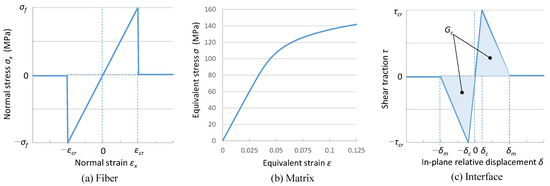 The failure of the fiber–matrix interface was considered by inserting cohesive elements. As its constitutive model, the bilinear traction-relative displacement relationship of the Dugdale model was adopted, as shown in Figure 4c. The area below the curve corresponds to the dissipated energy during a unit area of crack growth, i.e., fracture toughness of the interface Gc [34].
