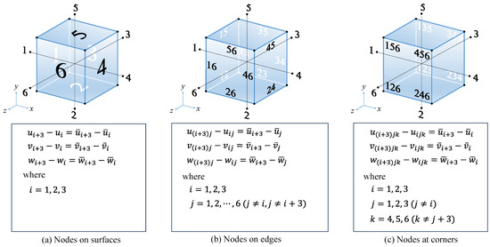 where u, v and w are displacements in the RVE along the x, y and z axes, and , and are displacements of the representative nodes. The subscripts represent the number of the surfaces. These conditions were incorporated in the model by the multipoint constraints (MPC) in the FEA code [35]. However, the conditions on the edges and corners of the RVE cannot be straightforwardly applied using Equations (3)–(5) because they are intersections of the two or three surfaces of the RVE. The equations for MPC had to be modified by removing redundant terms from the system of the equations, as shown in Figure 5b,c.