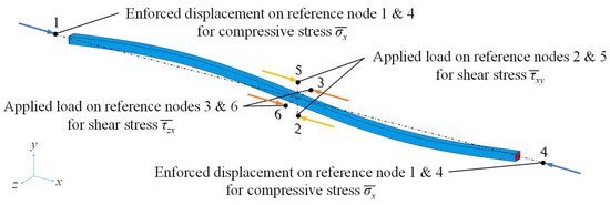 We analyzed the longitudinal response under compressive normal stress and its dependency on in-plane and out-of-plane shear loadings from the surrounding material, as mentioned before. The boundary conditions to apply these conditions are defined on the representative nodes of the RVE, as shown in Figure 6. Compressive loading was applied by enforced displacement at the first and fourth representative nodes. In-plane shear loading was subjected by applying point loads on the second and fifth representative nodes in the x direction. Similarly, out-of-plane shear loading was applied through point loads at the third and sixth representative nodes.