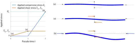 However, since constantly increased compressive displacement was applied as a boundary condition of the present numerical model, the snap-back of the displacement observed after the peak point in the theoretical model could not be reproduced in the numerical model. Instead, the displacement in the numerical model leaped to the equilibrium state with the increased displacement. This result is natural because it is quite difficult to trace the decrease in both stress and strain in physical tests, and the same response in the present numerical result can be observed in a compressive test with displacement-controlled loading. After the point of the leap, the relationships between compressive stress and normal strain and that between the stress and shear strain were correctly captured.