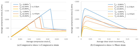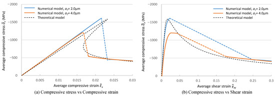 The relationship between macroscopic normal stress and strain in the longitudinal direction is shown in Figure 8a, and the relationship between macroscopic normal stress and shear strain induced by compressive loading is shown in Figure 8b. The dashed line indicates the theoretical result with fiber misalignment aT = 2 μm, and the solid blue line indicates the numerical results of the present model with the same misalignment. The relationship between and plotted in the figure was calculated using Equations (12) and (16), with the parameters described in Section 2.2. A case with a larger misalignment is also shown in red as a reference.