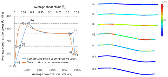 At point (o), a small shear deformation due to shear stress from the surrounding material was observed before the macroscopic compressive stress was applied. Although a slight stress concentration at the antinodes of the sinusoidal misalignment was observed, it was far lower than the allowable stress. The macroscopic compressive stress increased with increasing macroscopic strains. At point (a), the compressive stress of the fiber reached its allowable value and failed. At point (b), the macroscopic compressive stress reached its maximum value and began to decrease. This process is the same as that expressed in the theoretical model.