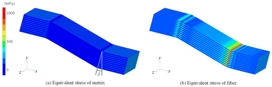 The relationships between stress and normal strain and those between stress and shear stress are plotted in a single graph on the left in Figure 9. In the graph, the stress levels at which important failure events occurred are marked as (a) to (d). The distributions of equivalent stress in the fiber at the marked points are shown on the right in Figure 9. The range of the contour band was set such that the stress above the allowable value is shown in red. Macroscopic shear stress τxy = 50 MPa had already been applied when the application of the compressive loading was started.