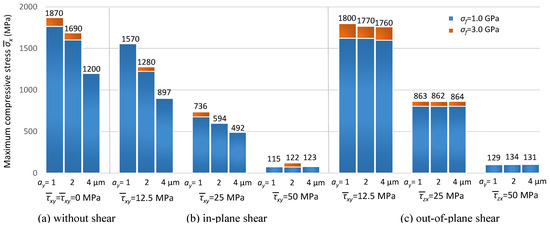 The dependency of the maximum compressive stress, i.e., compressive strength of the composite, on the different factors is summarized in Figure 12. A group of three bars indicates the difference in strength caused by the variation in fiber misalignments. In each group, the blue and red portions indicate the strengths of the composites with different fiber strengths. It can be observed that the effect of differences in fiber strength is not significant compared with that of fiber misalignment. This supports the hypothesis stated in previous studies that the compressive failure of the unidirectional composite is dominated by the shear failure of the matrix [2,3,4,5,6,7].