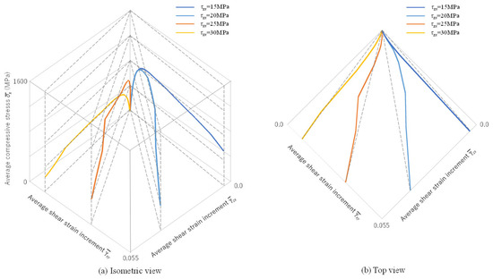 The shear responses induced by compression are shown as a three-dimensional plot in Figure 13. Figure 13a is taken from the isometric viewpoint, and Figure 13b is seen from the top. The z axis indicates compressive stress, and the x and y axes indicate macroscopic components of shear strain induced by compression in the in-plane and out-of-plane direction, respectively. The fiber misalignment aT for these cases was set to 4.0 μm, which is comparatively large among all the cases, and was incorporated in the in-plane direction of the composite. Therefore, when the external shear stress in the out-of-plane direction was small, compression-induced shear deformation mainly occurred in the in-plane direction, as shown in dark blue. With the increase in the out-of-plane component of external shear stress, the direction of macroscopic shear deformation changes toward the out-of-plane direction, and it occurred almost completely in the out-of-plane direction with = 30 MPa, as shown in yellow. It should be noted that the maximum compressive stress decreased with the increase in the external shear stress.