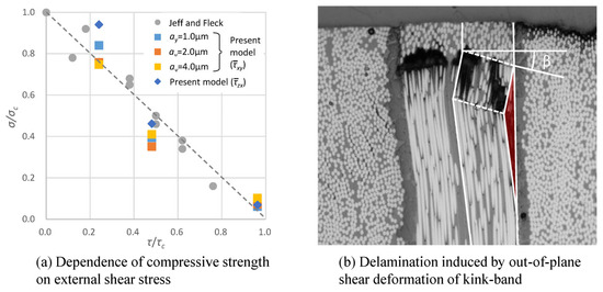 Figure 14a shows the results of present analysis and experiments obtained in a previous study by Jelf and Fleck [7] for comparison. In the previous study, compressive tests under a combination of longitudinal compressive loading and in-plane shear loading were conducted, and the dependency of compressive strength on the shear loading was studied. In the figure, compressive strengths σ normalized by the maximum value σc are shown on the vertical axis, and shear stresses τ normalized by the shear yield stress τc are shown on the horizontal axis. The gray circle markers in the figure show the results of the experiments, and the results of the present numerical analyses, which are shown in Figure 12, were normalized in the same manner as the experiments and plotted as rectangle markers. The authors of the previous study concluded that the compressive strength linearly decreased with the increase in the shear stress, as shown as a dashed line in the figure. It can be seen that the present numerical results are consistent with the trend of the experimental results.