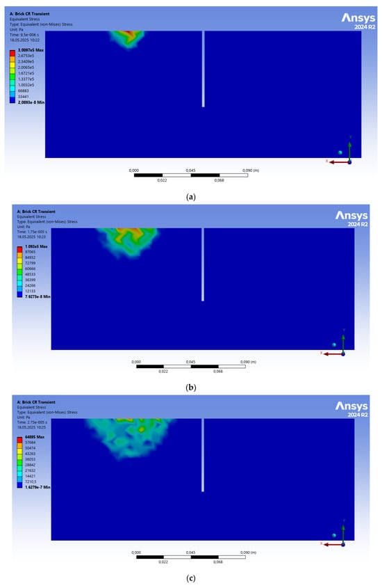 The successive evolution of the von Mises stress fields during the passage of an ultrasonic pulse for a brick with a 60 mm crack and porosity n = 0.14 is shown in Figure 7a–f.