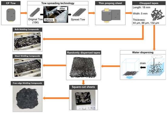 A CFRTP-SMC, BMC, and FMC were fabricated in this study. The main difference between these three SFRP is the tape dispersion processes. Figure 1 exhibits the fabrication flow chart of the CFRTP-SMC, BMC, and FMC. Carbon fiber tows (TR50S, Mitsubishi Chemical Co., Tokyo, Japan) were first spread using an air-jet spreading technique to create unidirectional prepreg tapes. These tapes were then laminated with polyamide-6 (PA6, DIAMIRON™ C, Mitsubishi Chemical Co.) films via compression molding to form thin prepreg sheets with an average thickness of 50 μm. The prepreg sheets were subsequently chopped into rectangular segments measuring 18 mm in length and 5 mm in width.