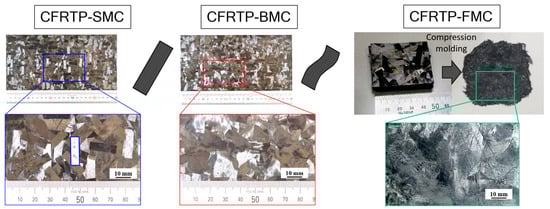 The molding processes of CFRTP-SMC, BMC, and FMC.