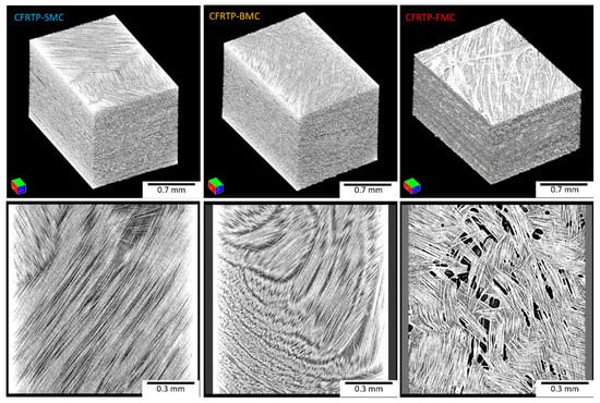 XCT 3D models and in-plane images of CFRTP-SMC, BMC, and FMC.