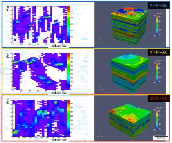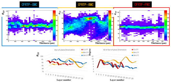 Out-of-plane orientation () distribution of CFRTP-SMC, BMC, and FMC by X-ray tomography.