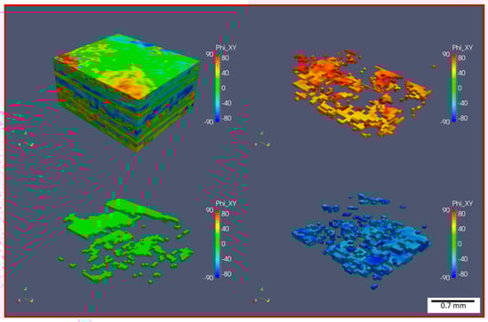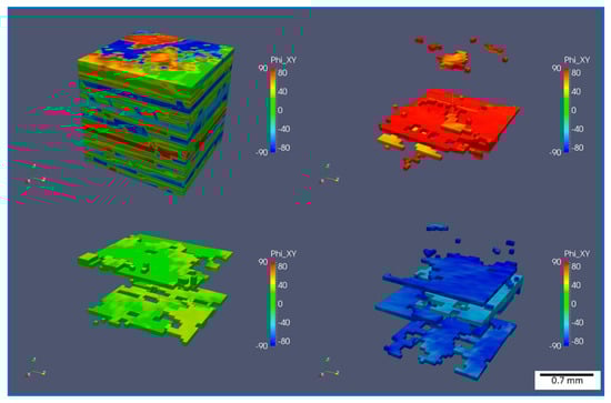 Figure 4, Figure 5, Figure 6 and Figure 7 present the in-plane fiber orientation distribution () for each material and the generated 3D model with visualized distribution. The CFRTP-SMC (Figure 4 and Figure 5) maintains its initial tape structure most effectively, with relatively uniform orientations and distinct lamination layers. This layered arrangement is easily visible in the 3D model and suggests minimal tape displacement during compression molding. By contrast, the CFRTP-BMC (Figure 4 and Figure 6) reveals tapes that are frequently deformed or clustered, with orientation “clusters” forming throughout the thickness. These clusters point to increased tape-to-tape contact in certain zones, most likely caused by higher flow stress during pressing. The CFRTP-FMC (Figure 4 and Figure 7) exhibits even more scattered fiber distributions. The tape morphology is barely recognizable, and the overall in-plane orientation shows more randomness, likely due to stronger in-plane flow within the free-edge molding region.