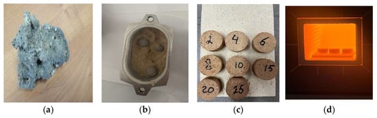 (a) Initial sample; (b) raw material mixture; (c) general view of the briquettes; and (d) sintered samples.