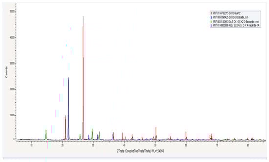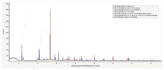 The chemical analysis was performed using an ARL QUANT’X spectrometer. Additionally, X-ray phase analysis was conducted on the averaged samples. The X-ray diffractograms and the quantitative composition of the ash and clay used in this study are presented in Figure 2, Figure 3 and Figure 4 and Table 2, Table 3 and Table 4. X-ray diffraction (XRD) analysis was conducted on a D2Phaser Bruker X-ray diffractometer with a Siemens KFL-CU-2K Cu-2K X-ray tube (copper anode). Phase identification and quantitative phase content calculations were performed using the DIFFRAC.EVA (Version V7) and DIFFRAC.TOPAS software (Version 3.7.0.). The instrument error, according to the technical specifications, is 0.3%.