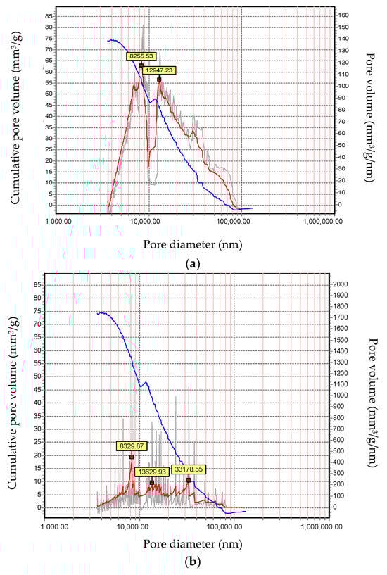 Total open porosity and pore size distribution: (a) sample 0; (b) sample 3.