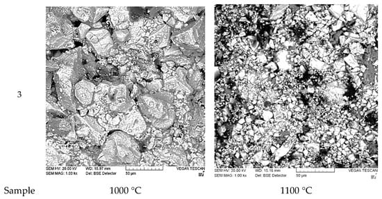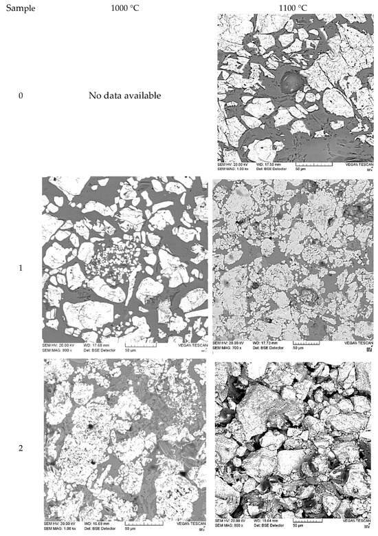 In all the investigated samples, the structure can be approximately characterized as biphasic, consisting of dark and light regions. As the fly ash content in the sample increases, the light particles become more closely spaced, and the gaps between them decrease. Increasing the firing temperature results in the formation of a more dispersed and homogeneous structure. Compared to the reference material, all experimental samples exhibit a denser and more uniform structure. It should be noted that the structural characteristics of the experimental samples differ significantly from those presented in other studies focused on the use of fly ash [5,9,10,11]. In the referenced papers, the particles exhibit a more rounded shape, and the overall structure is more layered. In contrast, the structure of the experimental samples shows distinct boundaries between the particles, with irregular particle edges and a significant variation in particle sizes. This is despite the fact that the initial batch primarily consisted of a 2–3 mm fraction. The structure of Sample 0 (ShA-grade refractory brick) is provided for comparison. It consists of larger particles that are clearly separated from each other. The structure of the experimental samples is primarily determined by the shape of the fly ash particles used in the study. In contrast to the studies [5,9,10,11], where fine, volatile “soft” fly ash was utilized, the present work employed a dense ash-slag conglomerate. This material is formed during the combustion of low-grade bituminous coals with a high content of impurities, including various metallic inclusions.