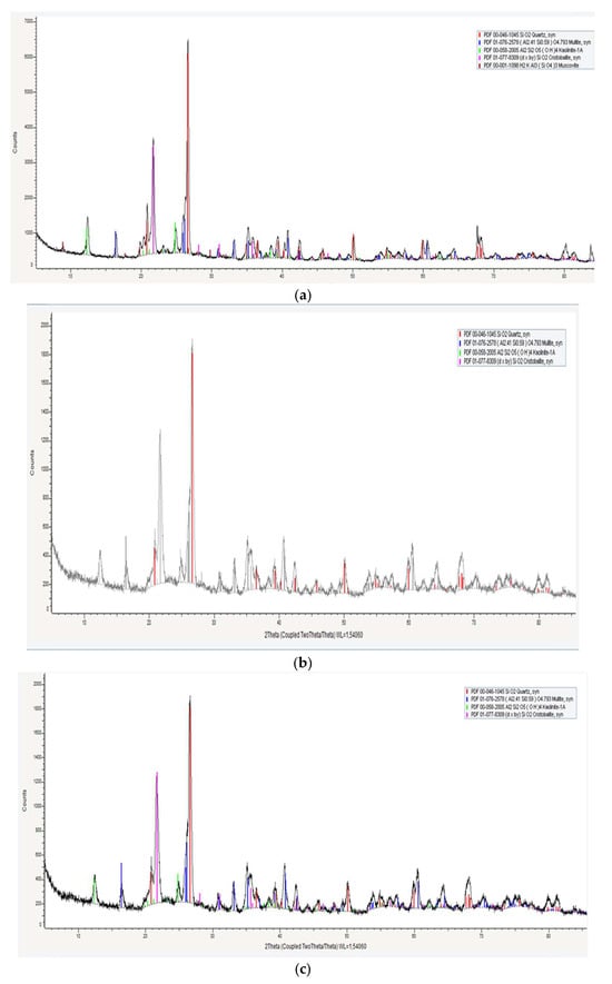 The distinctive feature of this clay is the presence of a significant amount of quartz and kaolinite, which contribute to its high refractoriness. According to studies on the transformation of kaolinite upon heating [22,23,24,25,26], kaolinite first transforms into metakaolinite (an amorphous phase), and subsequently into mullite and cristobalite.
