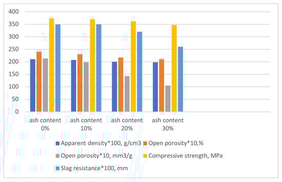Figure 9 presents a comparative diagram of the characteristics of the samples as a function of ash content in the mixture. For clarity, all data have been normalized to a common scale: apparent density is multiplied by 100; open porosity values are multiplied by 10; and slag resistance is multiplied by 100.