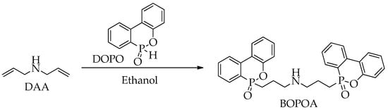 Several phosphorus-based flame retardants have been studied to enhance the flame retardancy of epoxy resins. Among these, DOPO has gained popularity across various industries due to its effectiveness and thermal stability [30]. Research indicates that incorporating nitrogen into flame retardants can promote the foaming of the burning polymer, thereby contributing to the material’s additional flame retardancy. In this context, Deng et al. developed a new flame retardant with a synergistic effect, combining phosphorus and nitrogen (BOPOA), synthesized from diallylamine (DAA) and DOPO (Figure 2). This flame retardant was utilized to create a fire-retardant epoxy resin based on DGEBA and the hardener 4,4′-diaminodiphenylmethane (DDM) [31].
