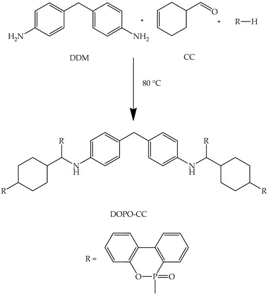 A more promising flame retardant for epoxy compositions is the one synthesized by Xiao et al. [33] through the reaction of 3-cyclohexene-1-formaldehyde and DDM with DOPO (Figure 4). Utilizing DOPO-CC, DGEBA, and DDM, compositions with phosphorus contents of 0.25% and 0.5% by weight were produced. Notably, the composition containing DOPO-CC exhibited a 78% reduction in TSP value compared to DGEBA, highlighting an advantage of the DOPO-CC flame retardant over the BSEA flame retardant.