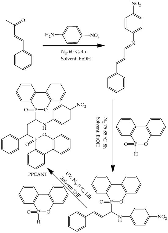 Yang et al. developed a phosphorus–nitrogen containing flame retardant (PPCANT) (Figure 5) and applied it to create epoxy composites to evaluate the flame-retardant performance and improve the mechanical properties, which were insufficient in DOPO-based composites [34].
