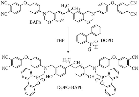 Synthesis scheme of DOPO-BAPh (reaction conditions—tetrahydrofuran, 60 °C, 12 h).