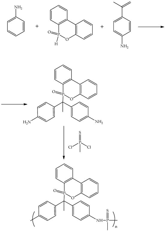 In addition to the phosphorus- and nitrogen-based flame retardants discussed in references [31,32,33,34,35,36,37], researchers are actively working on developing new flame retardants by combining phosphorus with various elements such as boron, sulfur, and silicon. This approach aims to create effective flame retardants and investigate potential synergistic effects. Jiang and his colleagues synthesized a novel macromolecular flame retardant known as DOPONH2-S, which contains phosphorus, nitrogen, and sulfur. This was achieved by reacting aniline and DOPO with p-aminoacetophenone, followed by a reaction with methylphosphonothione dichloride (Figure 8) [38].