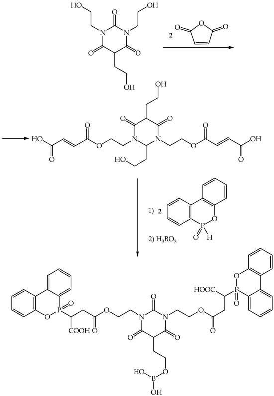 However, the flame retardants synthesized in [38,39] are high-molecular compounds, which makes it challenging to obtain a homogeneous system with epoxy resin and requires high temperatures to obtain a homogeneous composition (120 °C and above). The use of low-molecular organoelement compounds is more relevant from the point of view of their compatibility with epoxy oligomers. In line with the strategy of polyelement compositions, Chen et al. developed a boron-containing low-molecular-weight flame retardant and investigated the fire-protective and mechanical properties of the epoxy composition. They synthesized a novel carboxylic acid containing phosphorus, nitrogen, and boron (TMDB) through the esterification and reaction of 1,3,5-tris(2-hydroxyethyl)isocyanurate (THEIC), maleic anhydride (MAH), 9,10-dihydro-9-oxa-10-phosphaphenanthrene-10-oxide (DOPO), and boric acid (BA) (Figure 10) [40].