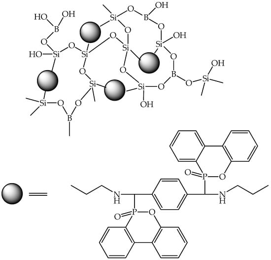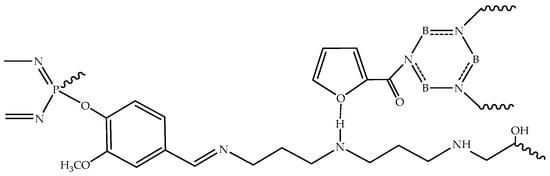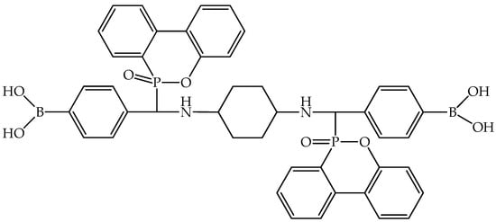 Zhang et al. developed a ternary hybrid flame retardant based on phosphorus, silicon, and boron, referred to as BSiP (Figure 11). This flame retardant was utilized to formulate flame-retardant epoxy composites cured with DGEBA and DDM. The synthesis of BSiP involved the reaction of p-phthalaldehyde and (3-aminopropyl)triethoxysilane, which was followed by a reaction with DOPO and boric acid. Remarkably, epoxy composites containing 3 wt% BSiP achieved a UL94 V0 rating (EP/3BSiP). Previously, the same authors reported a binary flame retardant based on phosphorus and boron BP (Figure 12) [42], which was also investigated for use as a flame retardant in epoxy composites.
