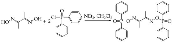 Shi et al. proposed a new flame retardant based on dimethylglyoxime-bridged phosphinate (DMG-DC) synthesized by the phosphonylation reaction of dimethylglyoxime (DMG) and diphenylphosphinic chloride (DPPC) (Figure 13) [43]. Epoxy composites were obtained by curing DGEBA and DDS with different ratios of DMG-DC, and the composites with 15% by weight DMG-DC (EP/DMG-DC-15) passed the UL 94 V0 test.