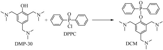 In response, Yang et al. proposed a phosphinate-based tertiary amine (DCM) as a curing agent for DGEBA-based epoxy resin [44]. DCM was synthesized through the reaction of diphenylphosphinic chloride and 2,4,6-tris(dimethylaminomethyl)phenol (DMP-30) (Figure 14).