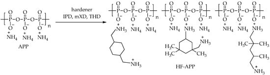 In this regard, researchers involved in the functionalization of APP in order to improve mechanical properties without compromising flame retardancy. For example, in [54], a functionalized APP was developed using a mixture of amine curing agents, including isophorone diamine (IPD), m-xylylenediamine (mXD), and 2,2,4-trimethylhexane-1,6-diamine (THD) (Figure 15).
