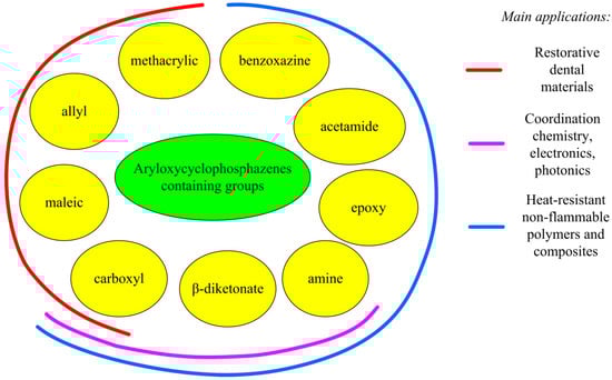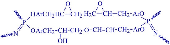 Aryloxycyclophosphazenes are highly promising flame retardants for modifying epoxy resins and their compositions, primarily due to their non-toxicity to humans [26], ease of functionalization, structural and thermal stability, and ability to maintain or enhance the mechanical properties of epoxy compositions [27,28]. While reviews have been published on DOPO derivatives and functionalized ammonium polyphosphate as flame retardants for epoxy compositions [29,30], there currently exists no critical review that analyzes the literature on the synthesis of organocyclophosphazenes as modifiers and flame retardants for epoxy compositions and comparison of their properties to other phosphorus–nitrogen compounds.