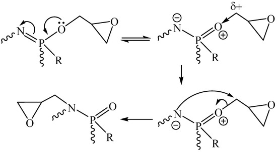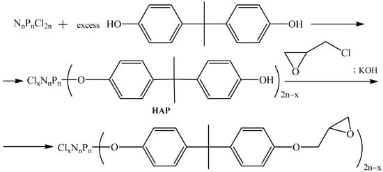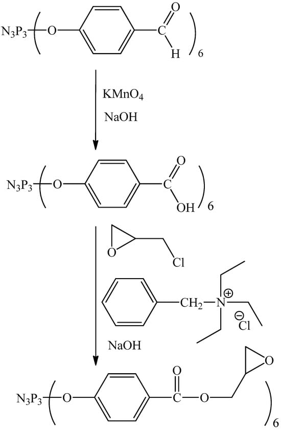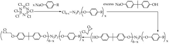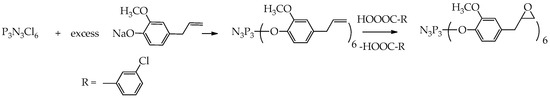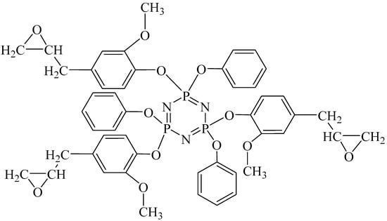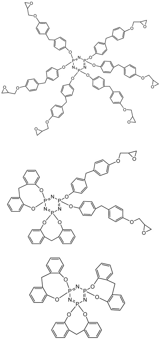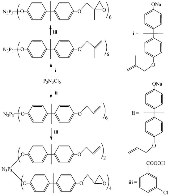 - Chistyakov, E.M.; Filatov, S.N.; Yudaev, P.A.; Kireev, V.V. Synthesis, characterization and epoxidation of hexakis-4-(2-(4-((β-methallyl) oxy) phenyl) propan-2-yl) phenoxycyclotriphosphazene. Tetrahedron Lett. 2019, 60, 444–448. [Google Scholar] [CrossRef]