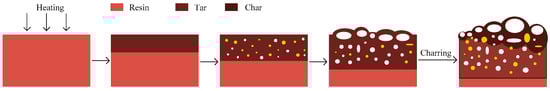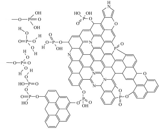 Among the inorganic and organo-inorganic compounds that enhance the fire resistance of epoxy resins, halogen-containing and halogen-free flame retardants—such as those incorporating phosphorus, nitrogen, silicon, or multi-element formulations—are particularly noteworthy. These flame retardants include salts containing nitrogen and phosphorus, such as ammonium polyphosphate [12], zirconium phosphate, and various phosphorus compounds. In contrast to halogen-containing flame retardants, these alternatives do not produce toxic smoke during combustion [13,14]. Phosphorus–nitrogen compounds offer a cooperative fire-retardant effect by generating a robust coke residue in the condensed phase (Figure 1) on the surface of the polymer during combustion while simultaneously forming non-combustible gases (CO2, N2, NH3) in the gas phase. This process reduces oxygen concentration and slows down combustion [15].
