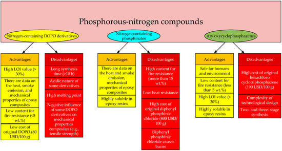 This study aimed to critically review of the literature in which various methods for obtaining phosphorus–nitrogen compounds and fire retardants were analyzed. This study evaluated key parameters such as the limiting oxygen index, vertical combustion test results, heat release, and smoke generation indicators. The thermal properties (such as glass transition and onset temperature) and mechanical properties of epoxy compositions modified with these compounds were also assessed. Based on the findings, the study also evaluated the profitability and potential for industrial production of the materials discussed.