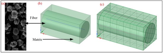 (a) SEM interface of a unidirectional composite, (b) RVE of a unidirectional composite, (c) block and conformal meshed RVE.