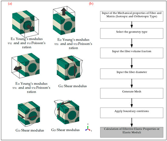 Various theoretical models have previously been proposed and developed to compute the elastic moduli of unidirectional composites, such as the Rule of Mixture (ROM), Modified Rule of Mixture (MROM), Halpin–Tsai model, Chamis model, Mori–Tanaka model (M-T), self-consistent model (S-C), and Bridging model (BM) [6]. ROM is the first theoretical simplified model that enables the calculation of elastic moduli (E11, υ12, E22, G12) by considering an equal amount of experienced strain on both fiber and matrix. Later, the ROM is modified into MROM, incorporating fiber length and orientations into the calculation; the modified theory enables the prediction of the elastic moduli (E22, G12), which was unattainable by ROM [6,7]. The Halpin–Tsai model is another well-known semi-empirical approach proposed for calculating the elastic moduli, specifically the transverse modulus (E22), within a suitable volume fraction range of 0.25 to 0.55 without unnecessary complexity [8]. The Halpin–Tsai model also considers the fiber aspect ratio, inter-fiber spacing, and fiber end gap in the transverse modulus of discontinuous fiber composites [9]. However, compared to other theoretical models and experimental results, it may exhibit negligible deviations in predicting the transverse modulus (E22) [9,10]. Another model, called the self-consistent model, is widely adopted in micromechanics to predict elastic moduli. This model primarily estimates elastic properties by considering inclusions, where a single particle inclusion is embedded in the effective medium [11,12]. Similarly, the Mori–Tanaka model (M-T) is also well-known for predicting elastic moduli [13,14,15]. The main benefit of this model is that it can consider the multiple filler ratios, fiber length distributions, and orientation of composites in the model [14]. Furthermore, it can also be used to compute the composite’s thermal expansion coefficient. For example, this study calculates the thermal expansion coefficient of composites employing the M-T model and found that the M-T model can predict the moduli in an identical manner compared to other theoretical models [13]. However, the M-T model may cause some difficulties, particularly where nonlinear analyses or time dependence are required to consider in composite materials [16]. The Bridging model is another popular micromechanics approach used to predict the transverse modulus (E22), as well as in-plane and out-plane shear modulus (G12, G23) of unidirectional composites [17]. This model is particularly convenient for micromechanical modeling since it can compute the elastic moduli by correlating the average stress states in the constituent fibers and matrix through the bridging matrix [18]. However, in recent times, the Bridging model has also been employed to predict the strength of an interface crack containing unidirectional composites. The investigations found that the Bridging model can predict the transverse moduli even in the presence of an interface crack. In addition, in comparison to experimental outcomes, the Bridging model showed good agreement for predicting off-axis tensile strength [19]. Similarly, the Chamis model has also been effectively used to predict the elastic properties of unidirectional composites [20]. This model enables the calculation of all independent effective properties, including E11, E22, υ12, G12, and G23. Notably, in this model, E11 and υ12 are calculated in the same formula as ROM, while the other moduli’s volume fraction (Vf) is replaced by its square root [6]. The Chamis model has also been further developed into the parallel-series model to compute moduli under more complex conditions, such as fiber undulations [21]. Overall, compared to other theoretical models, the Chamis model may provide better accuracy in its predictions [17].