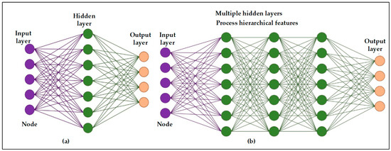 The type of error function or cost function depends on the specific task, for instance, cross-entropy for classification or mean squared error (MSE) for regression. The most common learning algorithm for FNNs is backpropagation combined with gradient descent (such as Adam) [55]. During training, the model iterates through the data multiple times, each iteration called an epoch, in which the weights are updated to minimize the cost function. Based on the number of hidden layers, an FNN can be further categorized as a shallow neural network (with one hidden layer) or a deep FNN (with two or more hidden layers) [56], as shown in Figure 3.