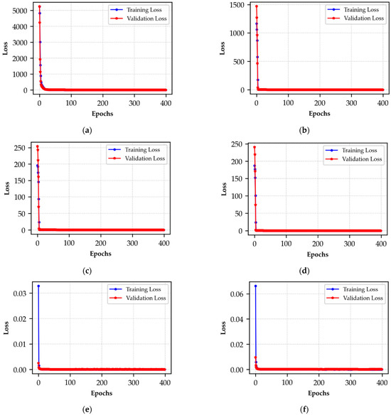 Training loss and validation loss vs. epochs: (a) E11, (b) E22 = E23, (c) G12 = G31, (d) G23, (e) V12 = V13, (f) V23.