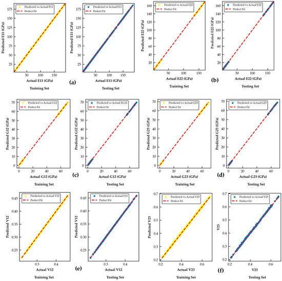 Predicted data vs. actual data during training and testing: (a) E11, (b) E22 = E23, (c) G12 = G31, (d) G23, (e) V12 = V13, (f) V23.