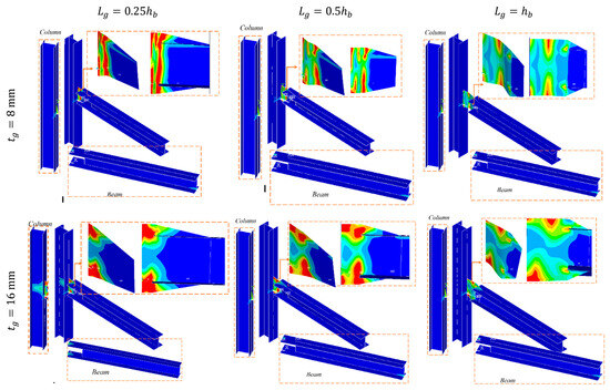 - For models with a slenderness ratio of , the beam and column experience low stress and remain largely elastic. However, when , yield stress concentrates solely at the corners of the gusset plate connection to the column, without developing in the gusset plate itself.