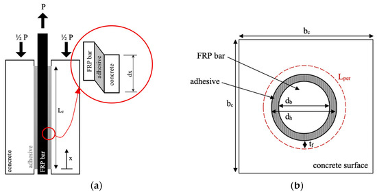 In developing the proposed bond model, several assumptions were made as follows: (1) the adherents are considered linear-elastic and homogeneous; (2) bending effects are neglected; (3) normal stresses are uniformly distributed across the FRP composite bar’s cross-section; (4) the diameter, width, and thickness of the adherents and adhesive remain constant along the bond line; (5) the thickness of the failure plane provides a uniform concrete cover around the FRP bar and along its pull-out length; (6) both the adhesive and concrete possess sufficient strength to ensure that failure occurs solely by pull-out; and (7) the adhesive serves only to transfer shear stress from the FRP bar to the surrounding concrete.