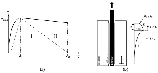 Proposed local bond–slip relationship: (a) curves for adhesively bonded FRP anchor–concrete joints; (b) side view of FRP bar/concrete joint when Stage I and Stage II meet.