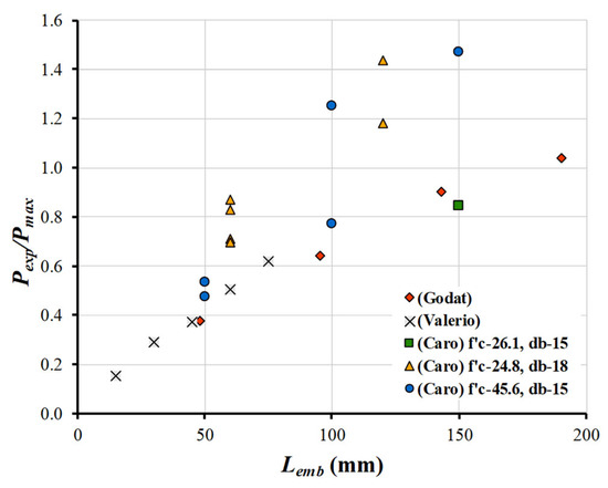 Figure 5 shows the ratio of Pexp/Pmax versus the embedded length (Lemb, in millimetres) for each tested specimen, evaluating the sensitivity of the model predictions to changes in Lemb. Data sets from different studies are colour-coded. Except for four specimens from Caro et al. [28], an increase in Lemb generally led to improved accuracy across all specimens. The most notable improvement occurred with the specimens from Godat et al. [26], where increasing Lemb from 143 mm to 190 mm not only enhanced accuracy but also reduced the gradient of error, indicating convergence toward Le, in agreement with experimental results.